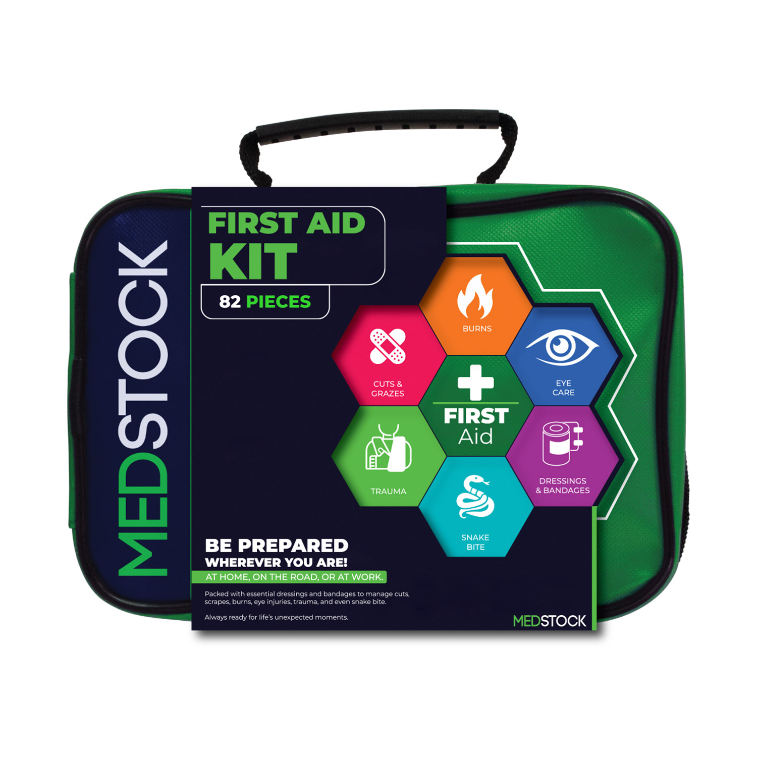 Medstock Premium Mini Modular First Aid Kit is a compact, comprehensive 82-piece first aid kit engineered to manage a wide range of injuries across home, workplace, vehicle, and outdoor environments. Packaged in a durable, soft-shell case with a reinforced carry handle, the kit’s modular design allows rapid access to clinically selected supplies organised across six key categories of care: Cuts & Grazes, Burns, Eye Care, Trauma, Snake Bite, and Dressings & Bandages.